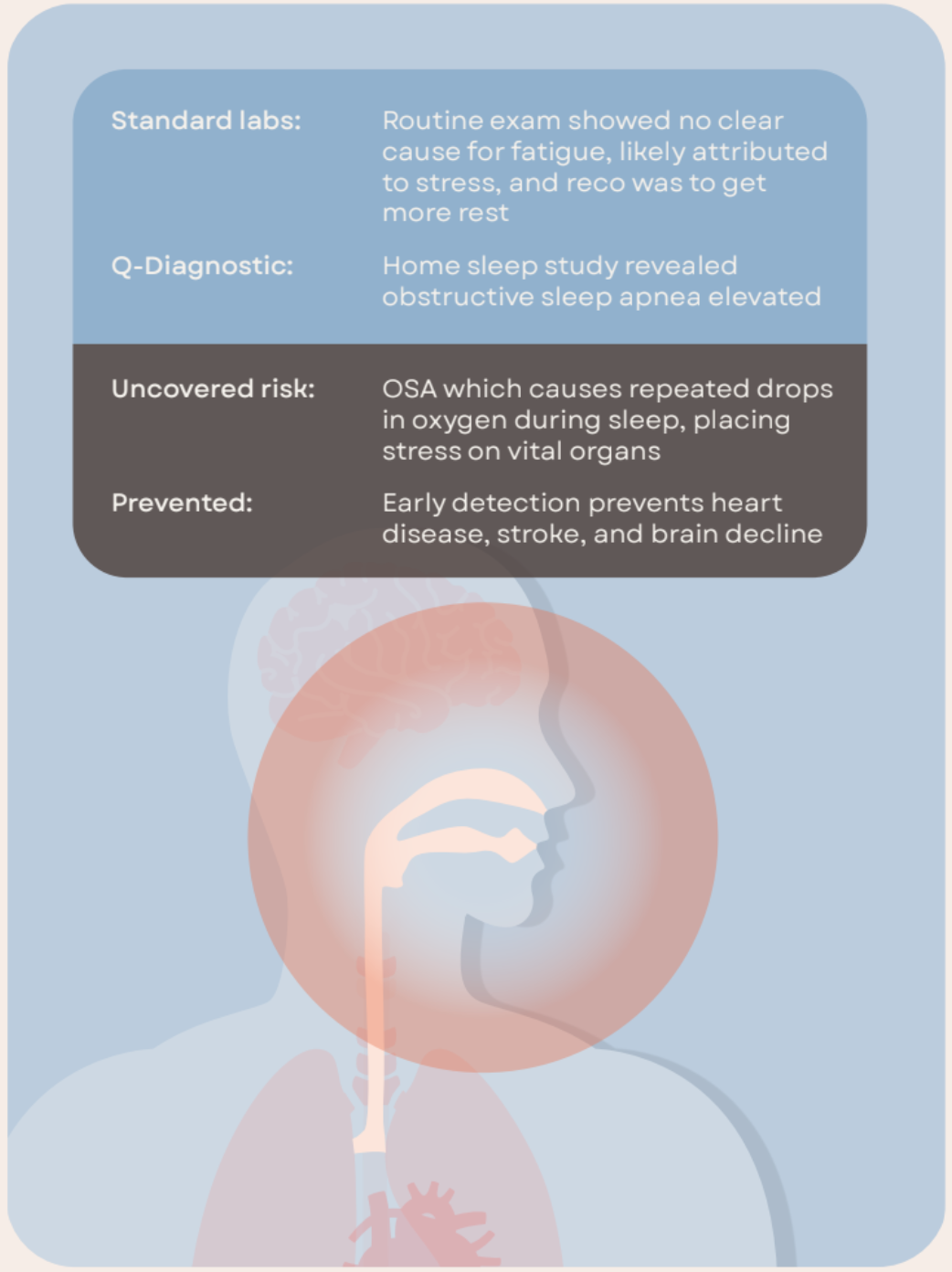 During his Q-Diagnostic Day, we asked several questions, ran advanced testing, and uncovered symptoms that revealed obstructive sleep apnea, a condition where breathing repeatedly stops and restarts during sleep. These pauses break up healthy sleep and can lower oxygen levels during the night, making it harder for the body and brain to fully recharge.