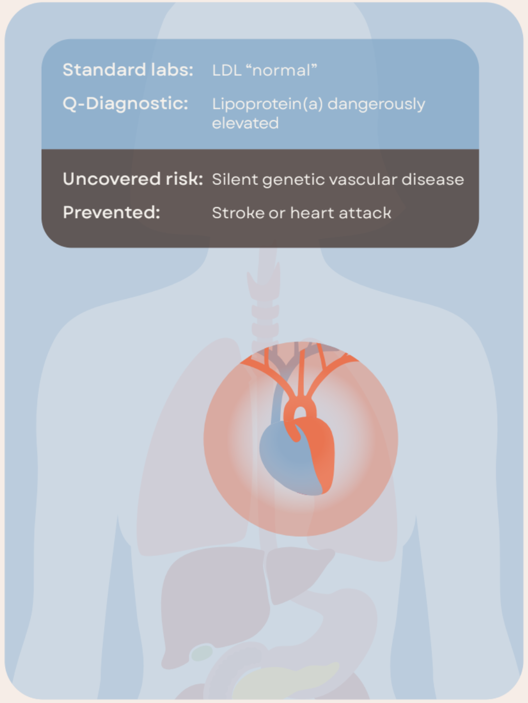 Her genetics revealed a high- risk vascular variant. Her lipoprotein profile showed a dangerous particle subtype that dramatically increases the likelihood of stroke and heart attack, a subtype traditional primary care panels do not measure.